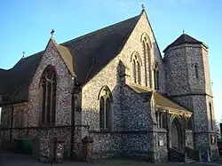 The church is built predominantly of flint with mouldings and window dressings of stone.[3] Internally very spacious,[6] it can hold up to 900 people.[4] Its south and west elevations face the street. At the east end is a three-bay chancel flanked by a Lady chapel and vestry to the south and north respectively. This adjoins the four-bay, north- and south-aisled nave, at the southwest corner of which is the octagonal tower.[3] A substantial, three-stage structure with a shallow cap at the same height as the nave roof, the tower was in fact intended to be much taller and topped with a spire rising to 160 feet (49 m); but the extension and spire were never built.[4][6] The entrance is in a porch which runs along the length of the west face.[3]