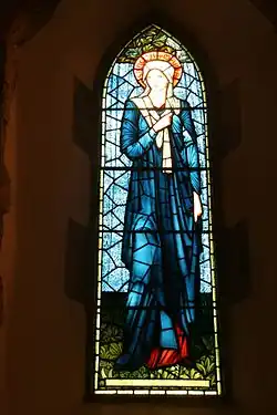 The main structures of the nave, chancel and tower are all original. There are a series of trefoil and lancet windows on all sides, many of which are paired. Many of these have stained glass; most were designed by Edward Burne-Jones. In particular, the east wall has three tall lancet windows and a quatrefoil;[2] the lancet windows, installed in 1893 in commemoration of Burne-Jones's daughter Margaret's marriage, represent the archangels Gabriel, Michael and Raphael.[11]