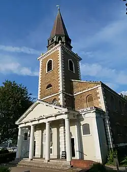 The church is built of brick, with stone used for quoins and other dressings. It consists of a nave, rectangular in plan, an apse at the east end forming the sanctuary, and a west tower. The west front has a single storey entrance porch with Tuscan columns supporting a pediment. The tower, rising immediately behind it, is topped with a clock chamber and a small spire. Inside, the whole width of the church is spanned by a flat ceiling, and there are wooden galleries supported by columns on three sides. The nave windows are in two tiers, the upper ones round-headed.[4][5]