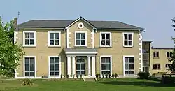 The elegant two-storey, tall-ceilinged house with many windows formed the heart of St Teresa's Convent School and forms the staff and administration building. It is at the end of the Ridings in Green Street and was built during the reign of William IV, that is between 1830 and 1837 to designs by an unknown architect. It is a Grade II listed building. It has a simple Doric porch (portico), central round window and open pediment with two bays to either side. Under John Alliston it became the manor house during a period of the late Industrial Revolution with increasing population in the region, when the products of the manor's agriculture and fishing were insufficient to support the local population. The former manor house close to the Thames was rebuilt in 1851 as Sunbury Park House. These buildings were described as such in a map of 1865.[2] In 1898, it was the home of William Anthony Mitchison, who planted the 1 mile (1.6 km) avenue of horse chestnuts forming The Avenue in the east of his estate. Before the opening of Sunbury Police Station in 1882, Mr Mitchison, who was the local Justice of the Peace (magistrate) had special permission to conduct the court in a room of this grand house.[3][4]