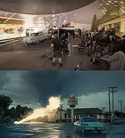 Filming of the tornado sequence from Steven Spielberg's The Fabelmans (2022) on the StageCraft Volume at Manhattan Beach Studios (top) and the finished scene (below).