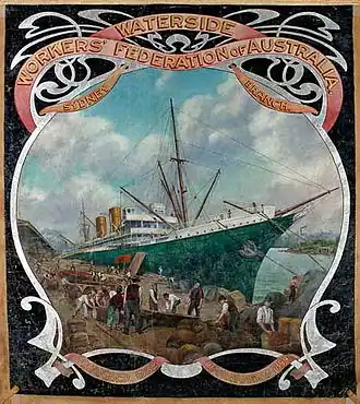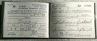 Bruce's attitudes towards industrial relations were varied, and he was initially unsympathetic to either employer or employee complaints, believing the best resolutions to be those brokered between businesses and their employees. He frequently called upon both sides to embrace a spirit of co-operation.[20] The situation became acute when waterfront workers led by the Seamen's Union went on strike in 1925. This had severe and immediate effect on the Australian economy, reliant as it was on sea transportation for its imports and exports, a situation the Prime Minister recognised as untenable.[116] With the union disregarding Commonwealth rulings on the dispute, Bruce rushed through the Navigation Act and the Immigration Act. The first allowed British and foreign shipping not working under Australian industrial awards to operate in Australian waters (although British vessels working in Australia would soon initiate a strike of their own). The second allowed the Commonwealth to deport any foreign-born person whom a special tribunal found guilty of "disrupting the industrial life of the community".[117][118] Key foreign-born strike leaders were immediately targeted for deportation, but New South Wales Premier Jack Lang refused to allow state police to serve summonses on two leading union leaders. Bruce responded with the Peace Officers Act, which re-established a Commonwealth police force.[119]