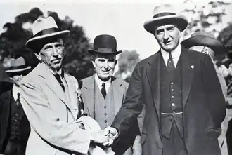 Bruce took office on 9 February.[20] His appointment as prime minister marked an important turning point in Australian political history. He was the first prime minister who had not been involved in the movement for Federation, who had not been a member of a colonial or state parliament, and who had not been a member of the original 1901 federal parliament. He was, in addition, the first prime minister to head a cabinet consisting entirely of Australian-born ministers.[62] Yet Bruce himself was frequently caricatured in public as "an Englishman who happened to have been born in Australia".[20] He drove a Rolls-Royce, wore white spats, and was often seen as distant and lacking the common touch: characteristics that did little to personally endear him to the Australian public.[20]