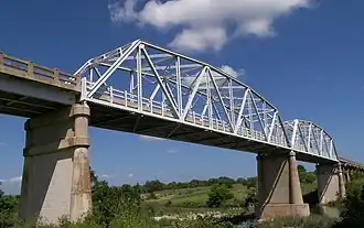 The State Highway 9 Bridge at the Llano River in Texas connects Mason County to the Gillespie County seat of Fredericksburg.[2] On June 14, 1935, a disastrous flood crested the Llano River at 41.5 feet (10 m), washing out the two truss spans, as well as the center pier, of the 1930 bridge of State Highway 9 across the Llano River in Mason County, Texas.[3] In effect, it isolated the town of Mason from the south. Reconstruction of the Llano River Bridge became an immediate priority.