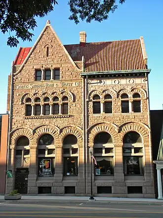 State Savings Loan and Trust is a historic bank building located at 428 Maine Street in Quincy, Illinois. The bank was built in 1892 for brothers Lorenzo and Charles H. Bull, who were prominent Quincy businessmen and community leaders. Chicago architectural firm Patton & Fisher designed the bank in the Richardsonian Romanesque style; local architect Ernest M. Wood designed an addition for the building in 1906. The building has a five-bay facade, with three bays on the original portion and two on the addition; the bays are each marked by a window with a thick stone arch. The original section is topped by a large front-facing gable, providing for attic space above the second story.[2]