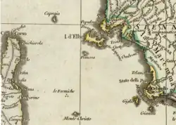 On 21 March 1801, by the Convention of Aranjuez, France and Spain agreed to establish the Kingdom of Etruria out of the old Grand Duchy of Tuscany and to award it the Principality of Piombino, while allowing France to annex the Tuscan part of Elba (Portoferraio). This fulfillment of these terms depended on the agreement of Naples.[22] On 28 March, following the defeat of his armies by the French during the War of the Second Coalition, King Ferdinand IV of Naples agreed, as part of the general settlement of the war, to cede the State of the Presidi, his rights on Elba (Porto Longone) and his claimed sovereignty over the Principality of Piombino to France on the understanding that they would be annexed to Tuscany to form the new Kingdom of Etruria. On 2 May, the French attempted to seize the Tuscan half of Elba, but the Tuscan garrison, with British assistance, resisted until the Treaty of Amiens of 25 March 1802 forced the British to evacuate. The formal cession of the Presidi to Etruria took place on 19 September 1801.[23] Thereafter, its fate follows that of the rest of Tuscany.[2] Piombino and Elba, however, remained under the French.[3]