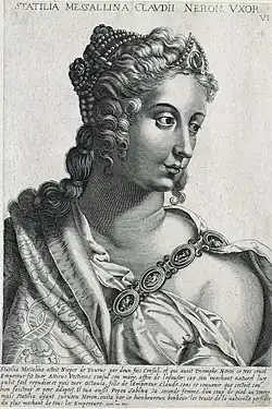 - Statilia T. f. T. n. Messalina, probably the daughter or niece of the consul Corvinus, her first husband was Marcus Julius Vestinus Atticus, consul in AD 65, whose destruction Nero wrought because not because of any wrongdoing, but because Atticus was too astute to be deceived by the emperor. Messalina became Nero's mistress, and then his third wife, after the death of Poppaea Sabina. Messalina was one of the few who survived the downfall of Nero. Otho, who had lost his wife to Nero, promised to marry her, but he fell in the year of the four emperors.[69][70][71]