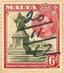 In 1938, the statue was depicted on a 6d Malta stamp along with Fort Manoel and the then-reigning British monarch George VI.[7] In 1948 this stamp was reissued with a Self-Government overprint and it remained in regular use until the mid-1950s.[8]