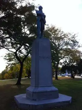 Count Casimir Pulaski is a public artwork by American artist Joseph Kiselewski located in Pulaski Park, which is in Milwaukee, Wisconsin, United States. The bronze statue is a 6-foot, full-length portrait of Count Casimir Pulaski standing atop a 17-foot granite pedestal.