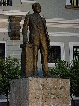 A statue of Enrique Díaz de León is installed in Guadalajara, in the Mexican state of Jalisco. It is located at the University of Guadalajara as Díaz de León served as the first dean after its re-foundation in 1925.[1]