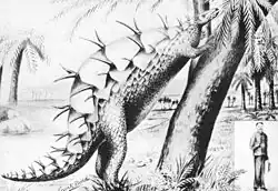 The 19th century American paleontologist Othniel Charles Marsh had named and first described Stegosaurus in 1877, originally interpreted from incomplete fossil remains as an aquatic reptile with turtle-like armor plates that lay flat on its back.[1] Later discoveries allowed Marsh to restore Stegosaurus more accurately as a terrestrial plant-eating dinosaur, initially restored with a single row of plates aligned vertically along its back with eight pairs of spikes on the end of its tail.[2][3] By the end of the 19th century, Stegosaurus had emerged as one of the most notable American dinosaur discoveries and had passed from the realm of scientific research into the popular imagination, sparked by its strange appearance. In 1893, the British paleontologist Richard Lydekker had reacted with astonishment at Marsh's 1891 illustrations of the skeletons of Stegosaurus and Triceratops: "Prof. Marsh published restorations of two forms, which for strangeness and uncouthness exceed the wildest flights of the imagination."[4]
