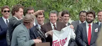 Carlton was traded to the Minnesota Twins in late July 1987. He went a combined 6–14 with a 5.74 ERA for both the Indians and Twins. The Twins won the 1987 World Series, albeit without Carlton on the postseason roster, to earn him a third World Series ring. Carlton made the trip to the White House to meet President Reagan along with his Twins teammates. When Carlton was photographed with his teammates at the White House, newspapers listed each member of the team with the notable exception of Carlton. Instead, Carlton was listed as an "unidentified Secret Service agent."[36]