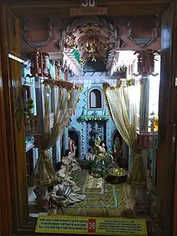 A diorama in Jain Museum of Madhuban depicting Sthulabhadra spending his chaturmas at Rupkosa's home, during which she tried to lure him away from ascetic life but failed.