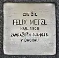 Metzl, FelixFelix Metzl was born in Třeboň on 13 April 1906 as a son of Emilie and Ludwig Metzl. He had five siblings and worked as a tradesman. On 18 April 1942 he was deported to Theresienstadt by Transport Akb, Nr. 751 from České Budějovice. From there, he was deported to Auschwitz on 1 October 1944 by Transport Emm, Nr. 254. He was murdered in Dachau concentration camp on 3 March 1945.