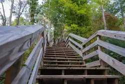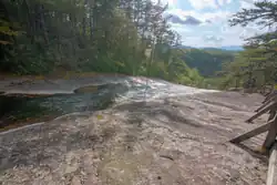 The centerpiece of the park is Stone Mountain, a dome of exposed granite (specifically a quartz diorite to granodiorite) of Devonian age, which has intruded into the gneiss of the Precambrian Alligator Back Formation.[3] It rises sharply over 600 feet (183 m) above the surrounding terrain. The mountain, which has an elevation of 2,305 feet (706 m) above sea level, is known for its barren sides and distinctive brown-gray color, and can be seen for miles. The mountain offers some of the best rock climbing in North Carolina, and the park's creeks and streams feature excellent brook trout fishing.