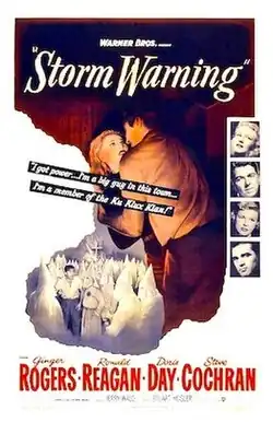 Storm Warning is a 1950[i] American thriller film noir[12] starring Ginger Rogers, Ronald Reagan, Doris Day, and Steve Cochran. Directed by Stuart Heisler, it follows a fashion model (Rogers) traveling to a small Southern town to visit her sister (Day), who witnesses the brutal murder of an investigative journalist by the Ku Klux Klan (KKK). The original screenplay was written by Richard Brooks and Daniel Fuchs.