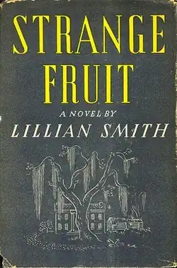 Strange Fruit is a 1944 bestselling debut novel by American author Lillian Smith that deals with the then-forbidden and controversial theme of interracial romance. Its working title was Jordan is so Chilly, but Smith retitled it Strange Fruit prior to publication.[2] In her 1956 autobiography, singer Billie Holiday wrote that Smith named the book after her 1939 song "Strange Fruit", which was about lynching and racism against African Americans. Smith maintained the book's title referred to the "damaged, twisted people (both black and white) who are the products or results of our racist culture."[3][4][5]
