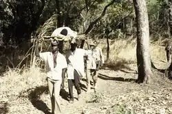 A flexible stretcher, also known by the brand names Reeves sleeve or SKED,[note 1] is a stretcher that is often supported longitudinally by wooden or plastic planks. Essentially a tarpaulin with handles, it is primarily used to move a patient through confined spaces, e.g., a narrow hallway, or to lift obese patients.[14] Reeves stretchers have six handholds, allowing multiple rescuers to assist extrication.[15]