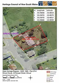 - ^ a b c d e f g h i j k l m n o p q r s t u v w x y z aa ab ac ad ae af ag ah ai aj ak al am an ao ap aq ar "Stroud House". New South Wales State Heritage Register. Department of Planning & Environment. H01969. Retrieved 2 June 2018.
