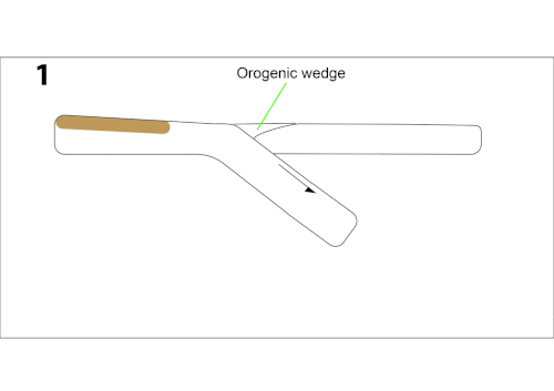 The initial setting of the simulated subduction zone model is confined by two pistons. The piston connected to the overriding plate is locked, while the piston linking to subducting plate is subjected to a constant rate of compression.[2] More importantly, there is a relatively thin magmatic arc and pre-existing fault dipping towards the subducting plate at the overriding plate.[2] The detachment of the pre-existing fault occurs when buoyant continental margin is in contact with the overriding plate.[2] It is because the buoyant margin resists subduction and significantly increases the frictional force in the contact region.[2] The subduction then stops. Subsequently, the new subducting slab develops at an overriding plate with the continuous compression.[2] The new developing slab eventually penetrates and breaks the old slab.[2] A new subduction zone is formed with an opposite polarity to the previous one.[2]