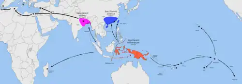 Map showing centers of origin of Saccharum officinarum in New Guinea, S. sinensis in southern China and Taiwan, and S. barberi in India; dotted arrows represent Austronesian introductions[16]
