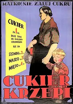 In 1930, the KPKC set up a new institution, Bureau of Propaganda for the Consumption of Sugar (Biuro Propagandy Konsumpcji Cukru, BKPC), to organise a more effective promotional campaign. The bureau was headed by Melchior Wańkowicz, a well-known publicist and propagandist at the time.[10] The BKPC's activities were aimed at improving the image of sugar in society and increasing its consumption. Learning from the BKPC's earlier failures, it focused on a wider range of activities, directing the campaign particularly to the Eastern Borderlands, where sugar was also popularised among the Ukrainian minority.[11] Despite the difficult economic situation associated with the Great Depression, the campaign was extensive and conducted with the cooperation of the Polish government.[12] New propaganda tools were introduced, including numerous posters and slogans.[13] The most well-known of these became the slogan Cukier krzepi ('Sugar strengthens [you]'), which quickly gained popularity.[14] Propaganda material was placed in the press,[15] on the radio[16] and on signs and billboards.[17] Slogans promoting sugar and stigmatising saccharin also appeared in Ukrainian, and the fight against saccharin continued as one of the main elements of the campaign.[18]