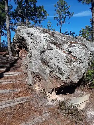 On published geologic maps of the area, Sugarloaf Mountain is mapped as part of the Middendorf Formation, a sequence of sandstone, pebbly sandstone, sand, silt, and clay that are interpreted as fluvial (river) deposits that accumulated during the Cretaceous Period.[4][5][6] While much of the mountain is composed of unconsolidated to semi-consolidated beds of quartz-rich sand, silt, and clay, outcrops and boulders of iron-cemented, pebbly sandstone can be found both on the mountain-side and the immediate vicinity. The iron-rich cement holding these sandstones together likely precipitated from groundwater interactions.