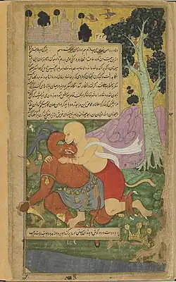 Together, Sugriva and Rama went to seek out Vali. While Rama stood back, Sugriva shouted a challenge and dared him to battle. The brothers rushed at each other, fighting with trees and stones, with fists, nails, and teeth. They were evenly matched and indistinguishable to the observer, until Sugriva's counselor Hanuman, stepped forward and placed a garland of flowers around Sugriva's neck. It is then that Rama emerged with his bow and drove an arrow through Vali's heart.[5] After Vali's death, Sugriva reclaimed the vanara kingdom, took back his first wife, Rumā, who became his queen. Vali's son Angada, became the crown prince.[6]