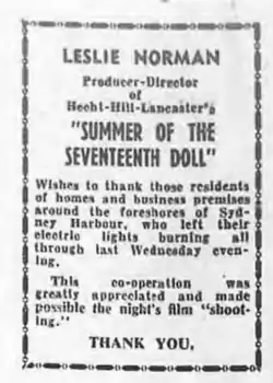 Norman felt the play flopped in the US due to unfamiliarity with Australian slang.[13] He said two versions of certain scenes were made, one for American audiences the other for Australian audiences. For instance, American scenes would refer to "dames" while Australian ones who refer to "sheilas". "In this way we hope to make the film a success in both countries," said Norman, who arrived in Australia on 9 December 1958.[23]