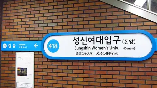 - ^ "Sungshin Women's Univ. (Line 4)". Seoul Metro. Archived from the original on 2017-02-28. Retrieved 2017-02-24.