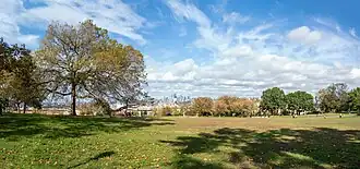 Sunset Park is between Fifth Avenue to the west, Seventh Avenue to the east, 41st Street to the north, and 44th Street to the south,[3] atop a 164-foot-tall (50 m) hill that is part of the Harbor Hill Moraine, a terminal moraine formed during the Last Glacial Period.[4] The park's elevated location offers views of New York Harbor, Manhattan, the Statue of Liberty, and more distantly the hills of Staten Island and the U.S. state of New Jersey.[3][5] Initially, Sunset Park contained a pond within its borders. According to Sergey Kadinsky, author of the book Hidden Waters of New York City, the pond was likely artificial since it did not appear on any maps prior to the park's creation. The pond was destroyed in 1935 with the construction of the current swimming pool.[6] The Sunset Park Memorial Grove was planted in 2002 to commemorate victims of the September 11 attacks.[7]