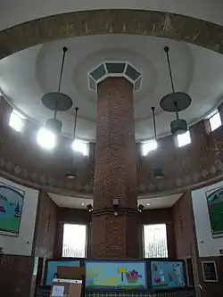 The Sunset Play Center's bathhouse is on the eastern side of Sunset Park. The building contains a facade of brick in Flemish bond, and consists of a 1+12-story rotunda with one-story wings to the north and south, giving it a rough I-shape.[12][13] The main entrance to the bath house, the eastern facade at Seventh Avenue, is approached by a short granite stairway, though there is also a handicap-accessible ramp to the south of the steps. It leads directly to the rotunda. A back entrance, from the west, leads directly to the swimming pool. The top of the building facade is wrapped with a motif composed of cast stone and brick chevrons, set in a pattern of diamonds and triangles.[13] The interior of the rotunda contains a similar motif along the top of the wall.[14]