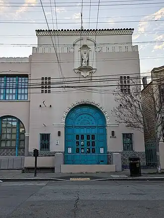 The San Francisco School Department took over the Sunshine School, some three years later.[6] The Sunshine School building was built between 1935 and 1937, by the Public Works Administration (PWA), in a Spanish colonial revival architecture style with details from Moorish revival and Art Deco architecture.[1][7] The building exterior features decorative tiles. The school was designed to serve two populations; students with physical disabilities occupied the first floor level with a therapeutic swimming pool and gymnasium, and students with illnesses (both chronic and acute) occupied the second floor with open‐air rooms.[1]