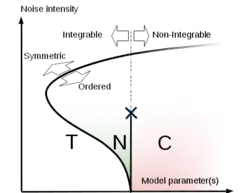 STS offers the following explanation for the Edge of chaos (see figure on the right).,[22][48] In the presence of noise, the TS can be spontaneously broken not only by the non-integrability of the flow vector field, as in deterministic chaos, but also by noise-induced instantons. [49] Under this condition, the dynamics must be dominated by instantons with power-law distributions, as dictated by the Goldstone theorem. In the deterministic limit, the noise-induced instantons vanish, causing the phase hosting this type of noise-induced dynamics to collapse onto the boundary of the deterministic chaos (see figure on the right).
