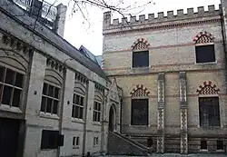 The original 1851 engine house is in the northwest corner furthest from Surrey Street in brown brick and bears the date 1851 on its west elevation.[1] The well was enlarged to a depth of 77 feet (23 m) by Thomas Docwra and son.[11][12] Its diameter decreased in steps from 9 feet (2.7 m) at the top to just 1 foot (0.3 m) at the bottom.[13] The engine house was built on a tall brick plinth[1] over the well to house a pair of 24HP Cornish beam engines[3] from Sandys, Vivian and Co. of Hayle.[14][12] It was rebuilt by the local builder William Harris using material from the atmospheric railway engine house at Croydon, which the Local Board of Health had purchased from the London, Brighton and South Coast railway company for £250.[3][12] The Surrey Street pumping house was necessarily taller to house the engines with their 9’ (2.7m) piston stroke and plunger.[14] The doors and windows were also different to ease ingress and egress, and maintain aesthetic proportions. There is at least a nod to the railway's engine house on the north elevation, with a similar Tudor style and roofline gable and dormer.[15] The boiler house and chimney have not survived. To protect the engines, the installer Samuel Hocking invented the weighted balance valve.[16] If the mains riser broke, the valve would close and the engines would work against the weight to maintain a constant load and prevent the engines from speeding up and breaking. The engines could raise 40 gallons with each stroke[3] and by April 1853, less than 18 months after opening, both engines raised over 450,000 gallons daily to supply water to 1,900 homes.[17] Before the end of 1866, the engines were pumping up to 1.5M gallons daily.[18] The engines were powered by steam from three boilers that by June 1867 were in such a dangerous state they could not be used and subsequently shared new boilers installed for the second phase.[19] By about 1876 the engines were used as backup / standby[20] and had certainly stopped pumping by 1894.[21]