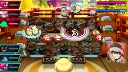 Sushi Striker: The Way of Sushido is a game where the player battles against opponents with sushi in order to defeat them. In battle, both the player and the opponent face each other, with conveyor belts of sushi, resembling sushi trains, between them. The player must match as many sushi plates of the same color as possible in order to gather them. Musashi will eat the sushi off the plates, and the plates will attack the opponent, causing their health to decrease.[3] This is also how the opponent attacks. The player and the opponent have three conveyor belts each to match sushi on, as well as one conveyor between them, for both to use. The game also offers online multiplayer.[4]