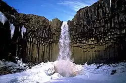 Svartifoss (Icelandic for "black waterfall", Icelandic pronunciation: [ˈsvar̥tɪˌfɔsː] ) is a waterfall in Skaftafell in Vatnajökull National Park in Iceland, and is one of the most popular sights in the park. It is surrounded by dark lava columns, which gave rise to its name. The base of this waterfall is noteworthy for its sharp rocks. New hexagonal column sections break off faster than the falling water wears down the edges.