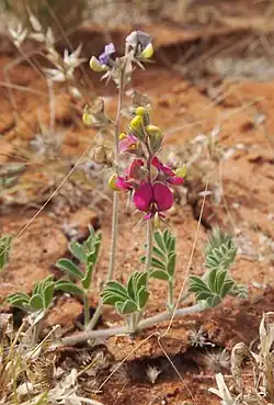 This species of pea usually grows near watercourses or floodplains near creeks or rocks holes in inland Australia, mostly in the Northern Territory, but there are also records from South Australia, Queensland and New South Wales.[2][3][4][5][6]