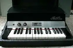 The earliest keyboard bass instrument was the 1960 Fender Rhodes piano bass, pictured to the right. The piano bass was essentially an electric piano containing the same pitch range as the most widely-used notes on an electric bass (or the double bass), which could be used to perform bass lines. It could be placed on top of a piano or organ, or mounted on a stand. Keyboard players such as The Doors' Ray Manzarek placed his Fender Rhodes piano bass on top of his Vox Continental or Gibson G-101 organ to play bass lines. About the same time, Hohner of Germany introduced a purely electronic bass keyboard, the Basset, which had a two-octave keyboard and rudimentary controls allowing a choice of tuba or string bass sounds. The Basset was in due course replaced by the Bass 2 and, in the mid-1970s, the Bass 3. All three were transistorized; the Basset was among the earliest solid-state electronic instruments. Similar instruments were produced in Japan under the "Raven" and "Rheem Kee Bass" [sic] names.