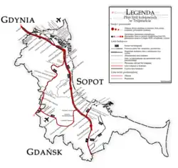 The SKM route has 27 stops covering the Tricity between Gdańsk, Sopot, Gdynia and Wejherowo, all located along one continuous line parallel to the coast of the Baltic Sea.[5] SKM service has been extended to Wejherowo and Lębork, 59 km (37 mi) west of Gdynia. The entire line is electrified, and service is operated by electric multiple unit trains at intervals of 6 to 30 minutes between trains (depending on the time of day) on the central section between Gdańsk and Gdynia, and less frequently on outlying sections. It is similar to a subway service or light rail in other European cities. The Tricity area is suited for this method of transport, as it occupies a relatively narrow north–south corridor between Gdańsk Bay and the Tricity Landscape Park.[6]