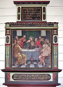 The altarpiece from 1647 is fitted on the north wall of the nave, with a painting of the Last Supper and the words of institution. The inscription reads: Gud Allermechtigste Hans Hellige Ord och Sacramenter Till Ere och denne Steed til Zirat haffuer Hans Sevrensen fordum Kiøbmand her paa Ferøe foraerit denne Altertaffle til Torßhaffns Kiercke 1647. ('For the Glory of God Almighty's Words and Sacraments and to ornament this Place, Hans Sevrensen, former Merchant on the Faroes, bestowed this altarpiece on the Church of Torshavn in 1647'). It is a rather simple piece of work from the late Renaissance, with a central section flanked by degenerated pilasters, a pedestal section and a small top section.