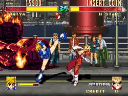 Attacks include standard punches and kicks as seen in many fighting games, but also includes special moves, and special techniques.[3] Unique to the game however, is a system called "reverse combo correction" by fans and one of the planners who is inexperienced in fighting games. In a typical fighting game, as combo attacks are chained together, the damage decreases. However, in this game, the damage actually increases as the combo is chained. This results in each characters being able to carry out combos that instantly kill the opponent.[5] Another feature is "homing jumps", which are special jumps which thrust you into your opponent.[6][4] Game modes in the PlayStation port include "Arcade mode", "VS mode", "training mode", and "story mode".[3]