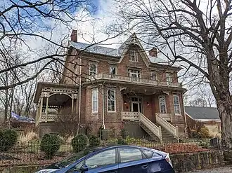 T. H. B. Dawson House is a historic home located at Berkeley Springs, Morgan County, West Virginia. It was built in 1880 and is an L-shaped, two-story, brick house with highly ornate porches at the front and side elevations. It features Gothic Revival and Italianate decorative elements. The house was built for T. H. B. (Thomas Hart Benton) Dawson (1840-1921), a native of Berkeley Springs who attained prominence in community service and business affairs. It 1866, he was elected county clerk of Morgan County and held that position for 36 years.[2]