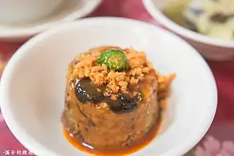 In many of their dishes, the Taiwanese have shown their creativity in their selection of spices. Typical spice mixes in Taiwanese cuisine are five-spice powder and hujiaoyan (literally pepper salt; a mixture of white pepper, salt, MSG, and sugar).[21] Taiwanese cuisine relies on an abundant array of seasonings for flavor: soy sauce, rice wine, sesame oil, fermented black beans, pickled radish, pickled mustard greens, peanuts, chili peppers, cilantro (sometimes called Chinese parsley)[22] and a local variety of basil (九層塔; káu-chàn-tha̍h; 'nine-story pagoda').[23] Widespread use of sugar is part of the legacy of Taiwan's commercial sugar industry.[24][25]