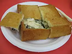 | Chiayi/Tainan | Coffin bread | 棺材板 | koaⁿ-chhâ-pang | Similar to French toast or bread bowl soups, but filled with savory fillings, such as black pepper beef or curried chicken. Thick-cut bread is dipped in egg, deep fried, cut along three sides, opened and filled, and eaten.[42] | |
