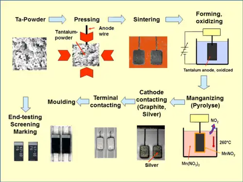 The picture below shows the production flow of tantalum electrolytic chip capacitors with sintered anode and solid manganese dioxide electrolyte.