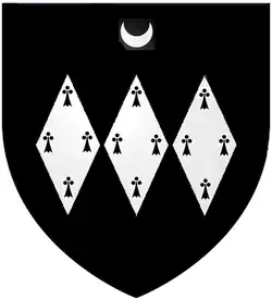 Arms of Giffard: Sable, three fusils conjoined in fesse ermine for difference a crescent in chief argent. The crescent denotes that the family seated at Brightley descended from a second son of an ancient Giffard patriarch