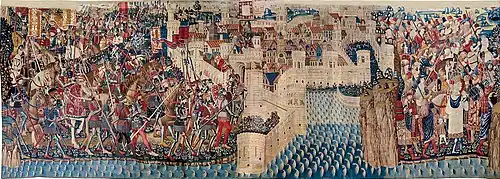 After a probable gap since the 11th century, in the late 14th century sets of tapestries returned as the grandest medium for "official military art", usually celebrating the victories of the person commissioning them.[39] Philip the Bold commissioned a Battle of Roosbeke set two years after his victory in 1382, which was five metres high and totalled over 41 metres in width. John of Gaunt, Duke of Lancaster insisted it was changed when Philip displayed it at a diplomatic meeting in Calais in 1393 to negotiate a peace treaty; Gaunt regarded the subject-matter as inappropriate for the occasion.[40] The Portuguese Pastrana Tapestries (1470s) were an early example, and a rare survival from so early.