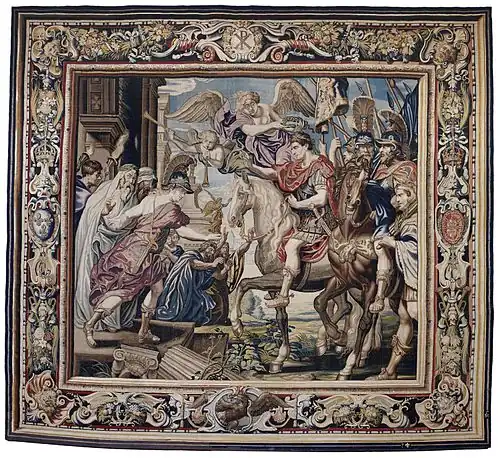 A set produced for John Churchill, 1st Duke of Marlborough showing his victories was varied for different clients, and even sold to one of his opponents, Maximilian II Emanuel, Elector of Bavaria, after reworking the generals' faces and other details.[41]