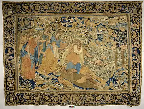 Many smaller pieces were made as covers for furniture or cushions, or curtains and bed hangings. Others, especially in the case of those made for patrons outside the top of the elite, were cut up and reused for such functions when they, or tapestries in general, came to seem old-fashioned. Bags, and sometimes clothing were other re-uses.[22] The Beauvais Manufactory became rather a specialist in furniture upholstery, which enabled it to survive after the French Revolution when this became the main remaining market. In the case of tapestries with precious metal thread, they might be burned to recover the metal, as Charles V's soldiers did to some of the Sistine Chapel tapestries, and the French Directory government did in the 1790s to most of the royal collection from the Renaissance.[23]